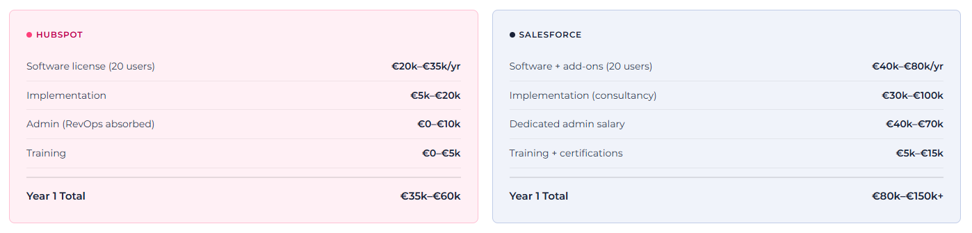 Over a three-year period, Salesforce typically costs 2 x – 3 x more than HubSpot for mid-size teams - not because of license fees alone, but because of the hidden operational costs: the dedicated admin, the consultant-heavy implementation, and the annual uplift baked into renewals (Salesforce applied a 6% list price increase in 2025 alone).