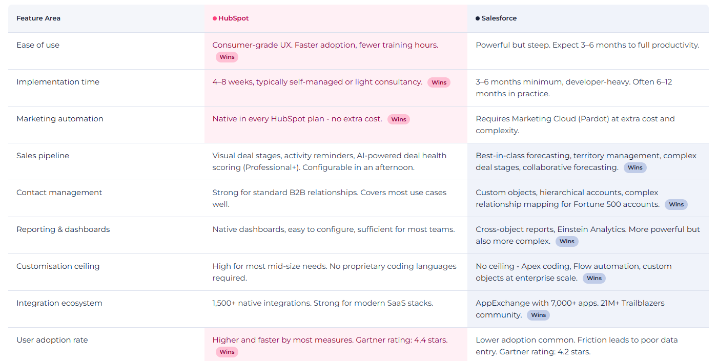Salesforce's learning curve is steeper by design - it's a platform built for customisation at enterprise scale, which means complexity is baked in. This often requires paid training sessions and creates friction for sales reps, leading to poor data entry. Poor data entry leads to bad attribution, which leads to bad decisions.