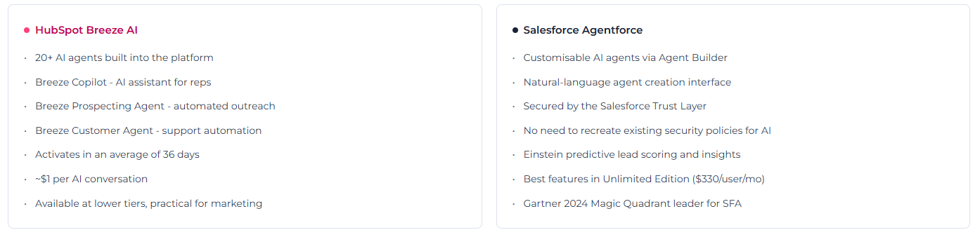 Both platforms have also launched significant AI ecosystems in the past year - HubSpot's Breeze AI and Salesforce's Agentforce - making the feature gap more interesting and the cost comparison more nuanced than ever.