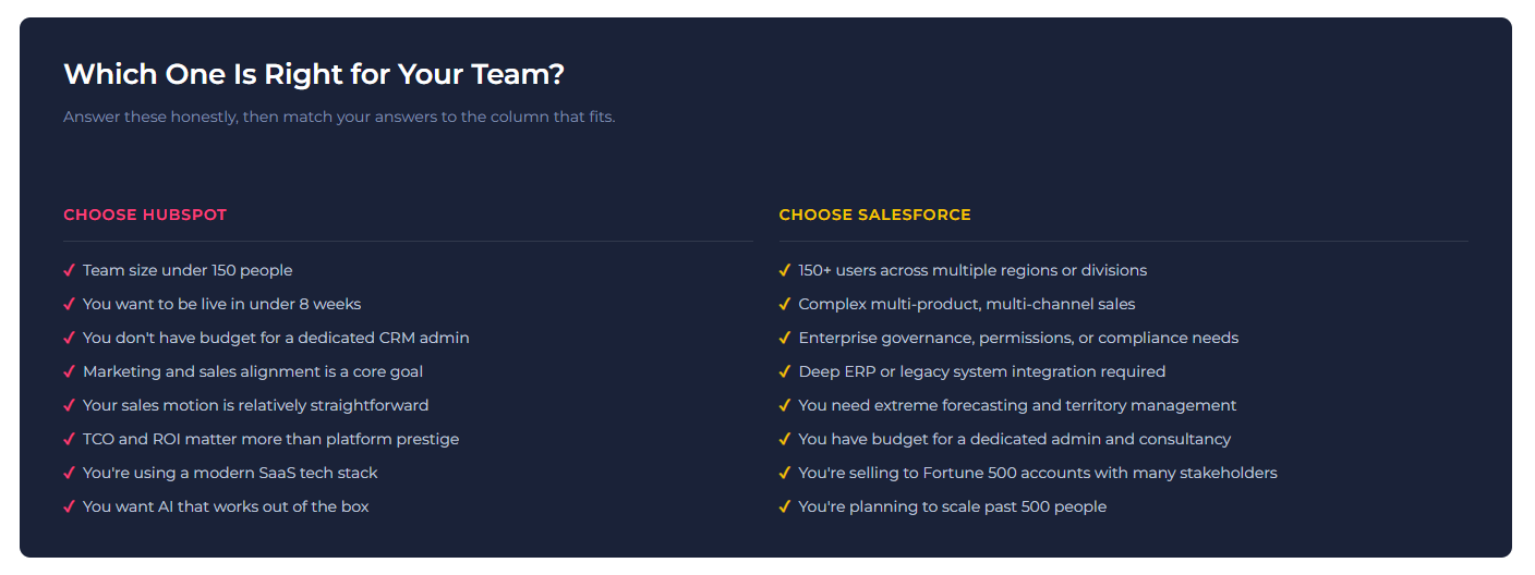 The split decision: If your answers are mixed between both columns, start with HubSpot. The consensus recommendation from RevOps practitioners is to start with HubSpot and revisit the decision at 100+ employees, rather than overpaying for Salesforce complexity you don't yet need.